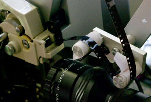 For particularly suspect looking films I first run them between hand winders (actually a dual 8 Goko film editor) with the film running between pads (pec pads) which have been wetted with the fluid. Then for all films I have added some pads to the incoming film path on the projector, again wetted with the fluid (on fresh pad surface) before each run. This helped in a number of ways: there are less dust spots on the images, there is less likelyhood of hairs in the gate and the film feed problems appear much reduced. It also seems to have helped with the wave problem mentioned later. There is now an 8mm version of the 35mm automatic film cleaner commonly used professionally created by Roy Neil (see 'Film O-Clean'), where the film runs over rollers, which then drive feed spools of cleaning material (well geared down) and so continually moves fresh cleaning material into the film path. This appears to be a most elegant solution, but at the moment a little too expensive for me. |